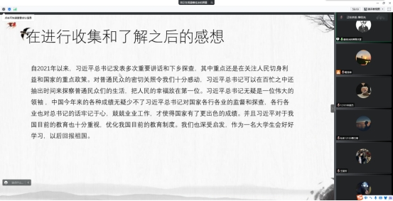 8月底,同学们通过分组进行调查、收集和整理相关文献、图片及视频等资料,小组成员共同制作完成分享PPT。结合自身所学专业,各小组成员分别分享了在调查过程中的所思、所悟。