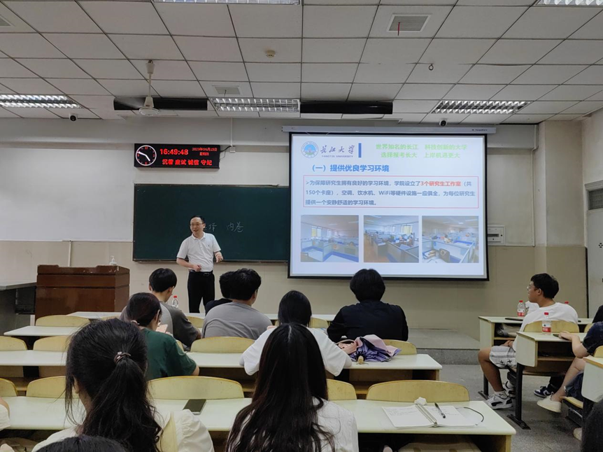 会议伊始,副经理熊猛上台讲话,对大家进行考研动员。首先,他从“内卷”和“选择”两个关键词谈起,指出选择比努力更重要,在这个内卷的时代,报考永利集团是一个明智的选择。然后他对永利yl23411集团的招生政策、专业设置和专业优势进行了简要的介绍和分析,还带领同学们了解了各专业考试科目及参考书目。“世界知名的长江,科技创新的大学,选择报考长大,上岸机遇更大”,熊猛老师鼓励同学们积极报考本院,破釜沉舟,全力以赴,共赴美好的明天。