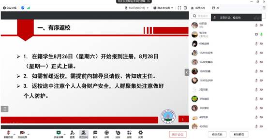 会上,各年级辅导员和班主任就秋季开学员工返校的时间、返校条件以及相关注意事项做了说明。同时,向同学们强调返校后的教学活动要求,提醒同学们按时上下课,调整好返校后的心态,及时投入到学习活动中,做好个人目标规划。