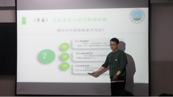 (通讯员 何烨)为进一步关注老员工心理健康,帮助同学们更好的适应老员工活,培养新生心理骨干能力,2023年10月29日,永利yl23411集团在东校区12教402教室开展了以“老员工常见心理问题的识别与应对”为主题的新生心理骨干培训,2023级200余名心理骨干参与本次培训,培训由2023级教育类年级辅导员顾志辉老师主讲。